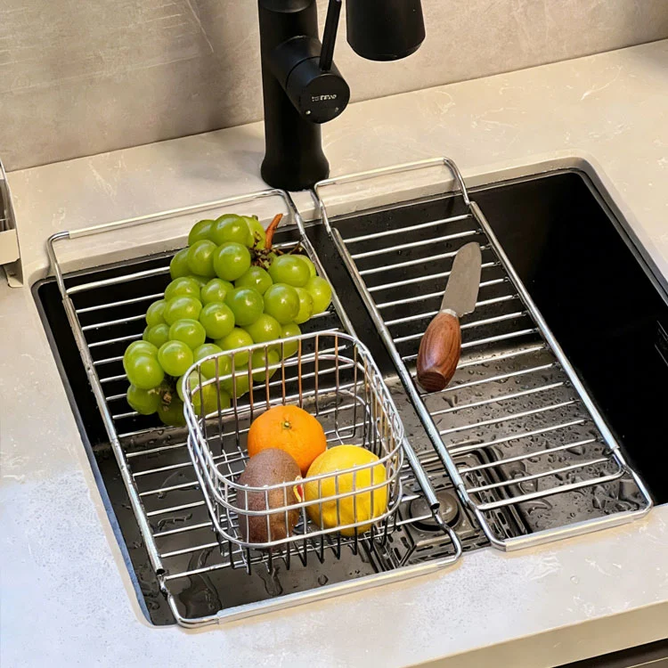 ဤတိုးချဲ့နိုင်သော စတီးလ်စတီးလ်ဇိမ်ခံစင်သည် မီးဖိုချောင်အတွင်း မကြာခဏအသုံးပြုလေ့ရှိသော သိုလှောင်မှုနှင့် ရေစုပ်ထုတ်နိုင်သော ဟာ့ဒ်ဝဲပစ္စည်းတစ်ခုဖြစ်ပြီး ရေကန်ဧရိယာရှိ အိုးခွက်များနှင့် ပါဝင်ပစ္စည်းများကို ခေတ္တသိမ်းဆည်းရန်အတွက် အထူးဒီဇိုင်းပြုလုပ်ထားသည်။ ၎င်း၏ ချိန်ညှိနိုင်သော အရွယ်အစား၊ သံမဏိပစ္စည်းနှင့် လက်တွေ့ကျသော ဖွဲ့စည်းပုံဖြင့်၊ ၎င်းသည် မီးဖိုချောင်ရေကန်ဧရိယာရှိ ပင်မသိုလှောင်မှုကိရိယာ ဖြစ်လာခဲ့သည်။